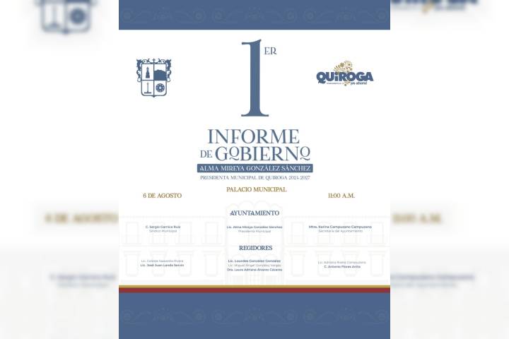 NOTICIAS 04/08/2025Presentará Alma Mireya González Sánchez su Primer Informe de Gobierno al pueblo de QuirogaCon el firme compromiso de rendir cuentas claras y transparentes a la ciudadanía, la presidenta municipal de Quiroga, Alma Mireya González Sánchez, invita a todas y todos los quiroguenses a su Primer Informe de Gobierno, que se llevará a cabo el próximo 6 de agosto, a las 11:00 a.m., en el Palacio Municipal.