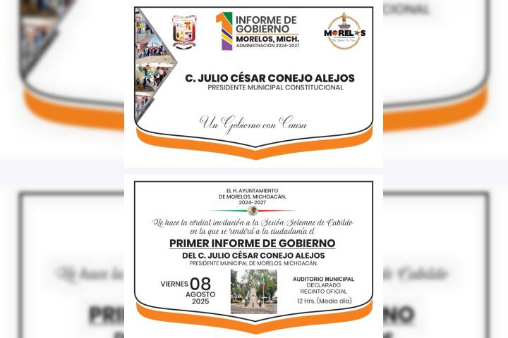 NOTICIAS 04/08/2025Rendirá Julio César Conejo Alejos su Primer Informe de Gobierno este viernes 8 de agostoEste viernes 8 de agosto, el presidente municipal de Morelos, Julio César Conejo Alejos, presentará su Primer Informe de Gobierno en un acto público que se llevará a cabo al mediodía en el Auditorio Municipal.