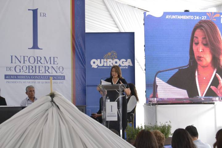 NOTICIAS 06/08/2025Rinde Alma Mireya González Sánchez su Primer Informe de Gobierno En sesión solemne de Cabildo, celebrada este miércoles en el Palacio Municipal, la presidenta municipal de Quiroga, Alma Mireya González Sánchez, presentó su Primer Informe de Gobierno, destacando que este primer año de administración ha sido un ejercicio de profundo amor y compromiso con la ciudadanía, logrando obras y acciones que están cambiando y generando desarrollo.