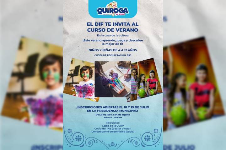 NOTICIAS 18/07/2025Invita Gobierno de Quiroga al Curso de Verano 2025 del DIF MunicipalCon el firme compromiso de ofrecer espacios seguros, recreativos y formativos para la niñez quiroguense, el Gobierno de Quiroga, a través del Sistema DIF Municipal, invita a todas las niñas y niños de 4 a 12 años a participar en el Curso de Verano 2025, que se llevará a cabo en la Casa de la Cultura del 21 de julio al 14 de agosto, en un horario de 10:00 a.m. a 1:00 p.m.