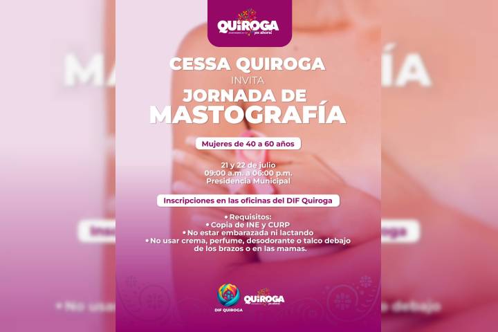NOTICIAS 21/07/2025Promueve Gobierno de Quiroga el cuidado de la salud femenina con jornada gratuita de mastografíaCon el firme compromiso de fomentar una cultura de prevención y cuidado integral de la salud, el gobierno municipal, en coordinación con el Centro de Salud de Servicios Ampliados (CESSA) y el Sistema DIF Quiroga, invita a todas las mujeres de entre 40 y 60 años a participar en la Jornada de Mastografía, que se llevará a cabo los días 21 y 22 de julio, de 09:00 a.m. a 06:00 p.m., en la explanada de la Presidencia Municipal.