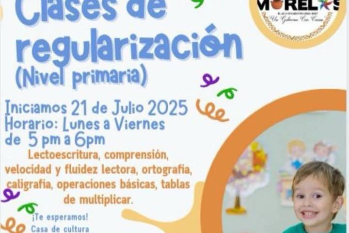 NOTICIAS 10/07/2025Refuerza Ayuntamiento de Morelos la educación básica con clases de regularización para niñas y niños en nivel primariaComo parte del compromiso de fortalecer el aprendizaje de nuestras niñas y niños, el Ayuntamiento de Morelos anuncia el arranque de un nuevo ciclo de Clases de Regularización para nivel primaria, a partir del próximo 21 de julio, en las instalaciones de la Casa de Cultura "J. Guadalupe Díaz Martínez".