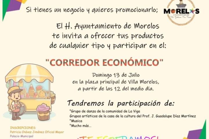 NOTICIAS 11/07/2025Impulsa Ayuntamiento de Morelos el desarrollo local con Corredor EconómicoCon el firme propósito de continuar fortaleciendo la economía local y brindar espacios de promoción a los negocios del municipio, el Ayuntamiento de Morelos, encabezado por Julio César Conejo Alejos, invita a emprendedores y comerciantes a participar en el Corredor Económico, el cual se llevará a cabo el domingo 13 de julio en la plaza principal de Villa Morelos, a partir de las 12:00 del mediodía.