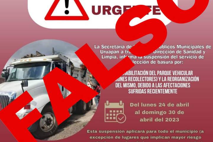 En grupos de redes sociales, se reenvían mensajes donde se asegura habrá suspensión de servicio de recolección de basura durante una semana bajo el argumento de que será reparado el parque vehicular. El servicio no será suspendido, por el contrario será reforzado por encomienda del presidente municipal, Ignacio Campos. Grupos políticos pretenden desinformar a la población sobre el tema para lograr beneficios que les favorezcan. Cualq...