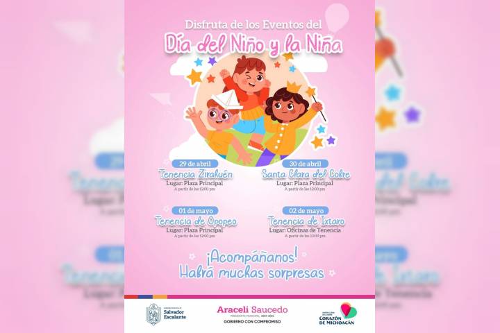 Con la intención de celebrar a los menores de edad de diferentes zonas del municipio, por motivo del Día del Niño y la Niña, este 29 y 30 de abril, así como el 1 y 2 de mayo, el Gobierno de Salvador Escalante llevará a cabo cuatro eventos infantiles. Así lo dio a conocer, la alcaldesa Araceli Saucedo Reyes, quien detalló que la primera celebración será en la plaza principal de la Tenencia de Zirahuén este 29 de abril, a las 12:00 p....