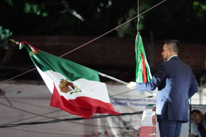 Pasadas las 10 de la noche, tras recibir el fuego simbólico en el Corazón de Michoacán, la edil enarboló la Bandera Nacional para