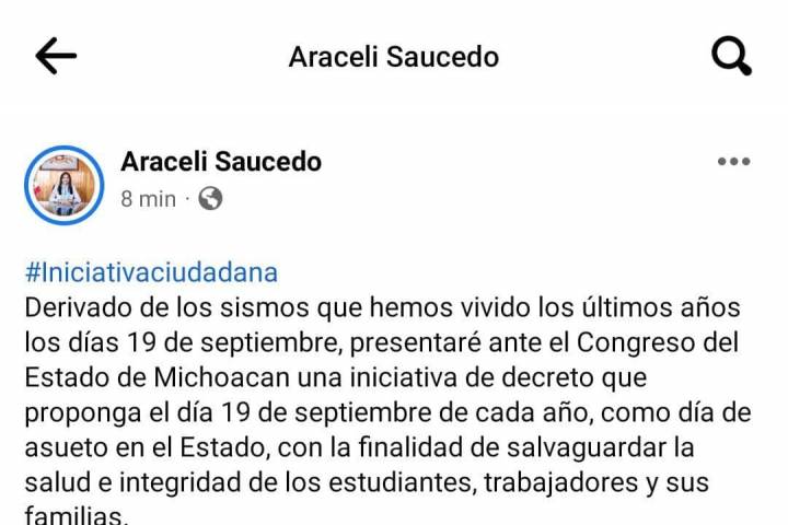 La presidenta municipal de Salvador Escalante, Araceli Saucedo Reyes, anunció que presentará una iniciativa ciudadana para que el 19 de septiembre de cada año se establezca como un día de asueto.