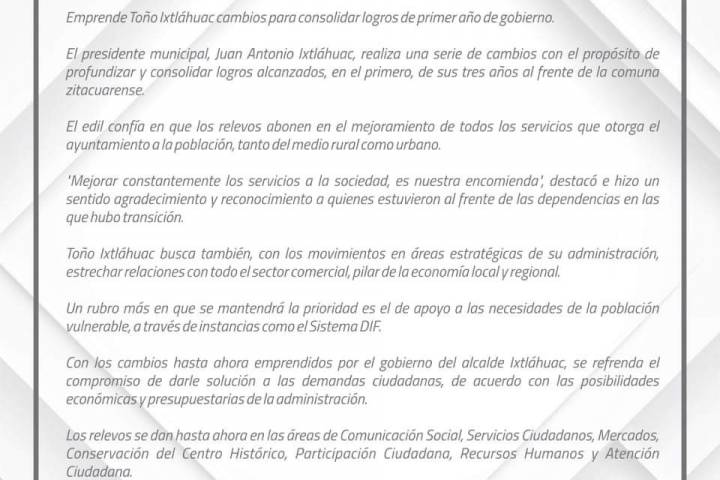 El presidente municipal, Juan Antonio Ixtlahuac, realiza una serie de cambios con el propósito de profundizar y consolidar logros alcanzados en el primero de sus tres años al frente de la comuna zitacuarense.