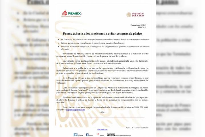 En un esfuerzo conjunto del Gobierno de México y 15 dependencias federales, Petróleos Mexicanos trabaja arduamente en erradicar el robo de combustible, al interior y fuera de la empresa. Apelamos a la comprensión de la población por los retrasos que continúan en el suministro del hidrocarburo, el cual quedará regularizado lo más pronto posible. Es importante destacar que en la Ciudad de México y área Metropolitana no hay desabasto de h...