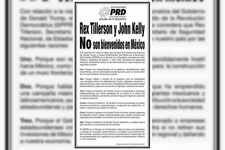 NOTICIAS 23/02/2017Secretarios Rex Tillerson y John Kelly no son bienvenidos a México.Con relación a la visita a nuestro país de altos funcionarios del Gobierno de Donald Trump, el Grupo Parlamentario del Partido de la Revolución Democrática (GPPRD) en el Senado de la República considera que Rex Tillerson Secretario de Estado y John Kelly, Secretario de Seguridad Nacional, de Estados Unidos, no son bienvenidos en nuestro país por las siguientes razones: