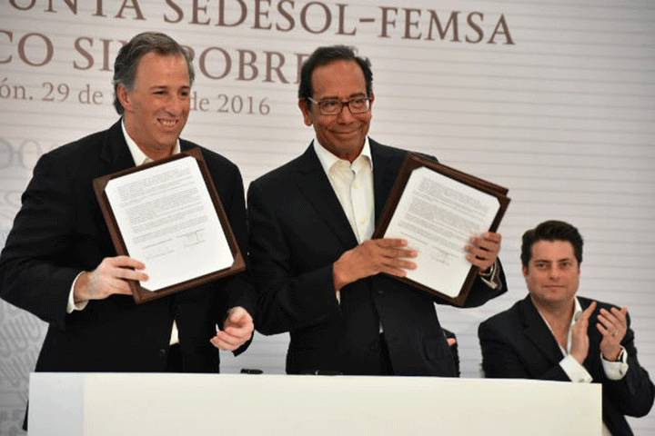 NOTICIAS 30/03/2016FEMSA y SEDESOL por un México inlcuyenteFEMSA y la Secretaría de Desarrollo Social (SEDESOL), a través de su Director General, Carlos Salazar Lomelín y de su titular José Antonio Meade, respectivamente, firmaron hoy una Declaración Conjunta con el objetivo de coordinar esfuerzos que promuevan acciones en materia de seguridad alimentaria, nutrición, acceso al agua y bienestar infantil para el desarrollo de la población.