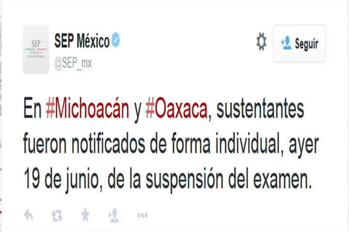 La Secretaría de Educación Pública (SEP) confirmó a través de un comunicado la suspensión de la aplicación de la evaluación docente en Oaxaca, " a efecto de garantizar las condiciones óptimas para la realización de este proceso". Además, a través de la cuenta de Twitter de la secretaría se informó que también en Michoacán la evaluación no se lleva a cabo. En el resto de los estados los exámenes se realizan con normalidad y...