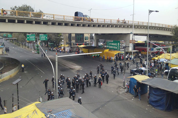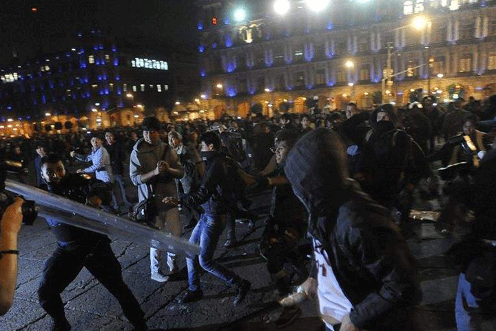 NOTICIAS 20/11/2014Granaderos y encapuchados se enfrentan; hay 15 detenidos Al menos 15 personas detenidas es el saldo preliminar tras los hechos violentos en los que grupos anarquistas atacaron a policías de la Secretaría de Seguridad Pública y elementos de la Policía de Investigación, en Boulevard Puerto Aéreo y Calzada Ignacio Zaragoza.