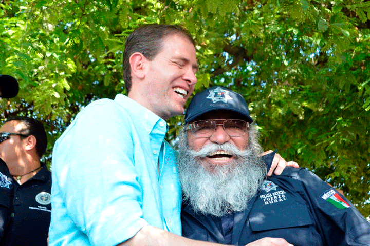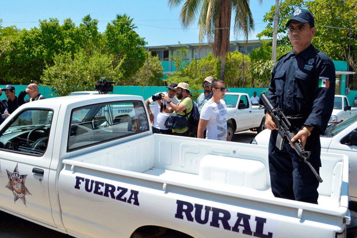 NOTICIAS 10/05/2014"Papá Pitufo" declaró sentirse feliz porque ahora él y sus compañeros serán quienes cuidarán sus propios pueblos.En pleno Día de las Madres tomaron protesta los primeros 240 elementos de la Fuerza Rural Estatal, todos ellos vecinos de este municipio y de Buenavista, mismos que coincidieron en referir que se sienten más seguros porque ya están legalizados y podrán vigilar sus comunidades sin ningún problema, con un AR-15 al hombro.
