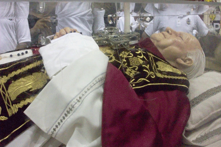 La vitrina que resguarda la imagen de cera de Juan Pablo II dormido, y que porta en su pecho una cruz co... Ver más...