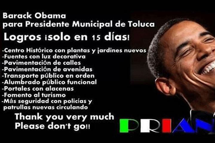 NOTICIAS 20/02/2014Piden tuiteros que Obama sea Presidente Municipal de Toluca"Barack Obama para presidente municipal de Toluca", es la frase con la que usuarios de Twitter agradecieron la visita el mandatario estadounidense, pues aseguraron que ésta provocó diversas mejoras en la capital mexiquense.