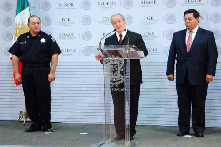 El secretario ejecutivo del Sistema Nacional de Seguridad Pública (SNSP), Monte Alejandro Rubido García, anunció las detenciones de dos supuestos operadores criminales en la Entidad; además de confirmar que policías de Apatzingán recibirán un intensivo adiestramiento y que ministerios públicos federales estarán durante los operativos realizados en el Estado, esto en una rueda de prensa ofrecida en Casa de Gobierno, en esta capital. ...