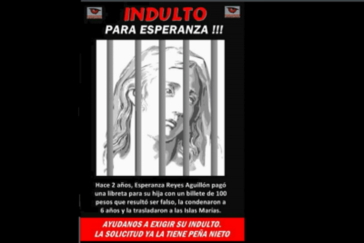 Esperanza Reyes Aguillón fue recluida en el penal de La Pila de San Luis Potosí, en espera de que se resuelva un procedimiento de indulto presidencial en su favor. En 2011, la mujer de 45 años acudió a una papelería de San Luis Potosí a comprar una libreta para su hija pagó donde sin saberlo, pagó con un billete falso de 100 pesos. La detenida fue acusada por el uso de moneda falsificada, delito federal y fue sentenciada a cinco añ...