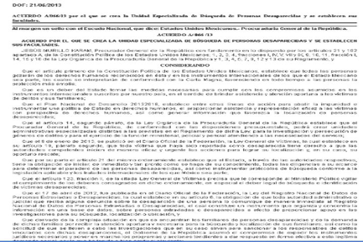 NOTICIAS 21/06/2013Publican acuerdo para unidad de búsqueda de desaparecidos