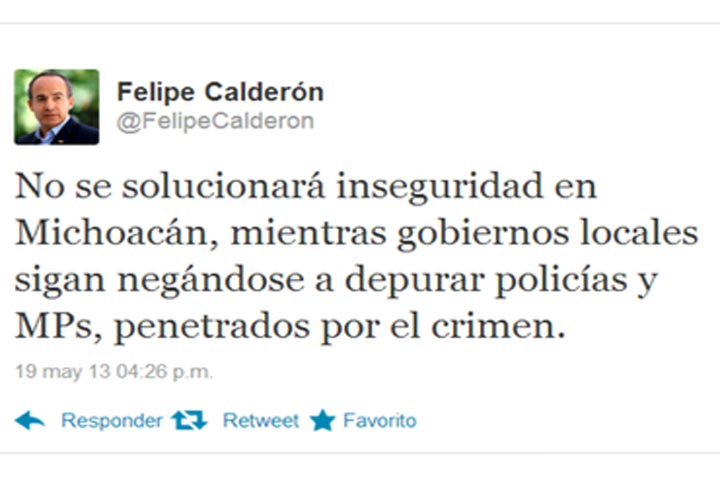 "No se solucionará inseguridad en Michoacán, mientras gobiernos locales sigan negándose a depurar policías y MPs, penetrados por el crimen", escribió Calderón en su cuenta de Twitter (@FelipeC... Ver más...