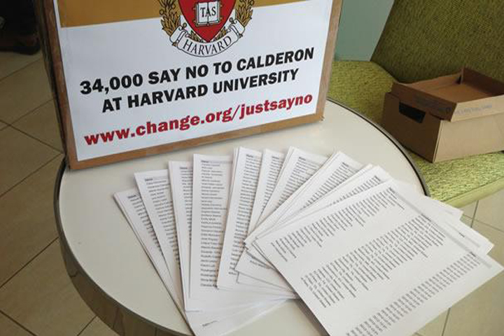 NOTICIAS 29/01/2013Recibe firmas contra el ex Presidente Felipe Calderón; pero decide mantener su estancia en HarvardLa Escuela de Gobierno John F. Kennedy de la Universidad de Harvard mantiene su decisión de otorgar la estancia académica de un año al expresidente mexicano Felipe Calderón, luego de recibir la mañana de este martes la petición de ciudadanos para su revocación, respaldada por más de 34,000 firmas.
