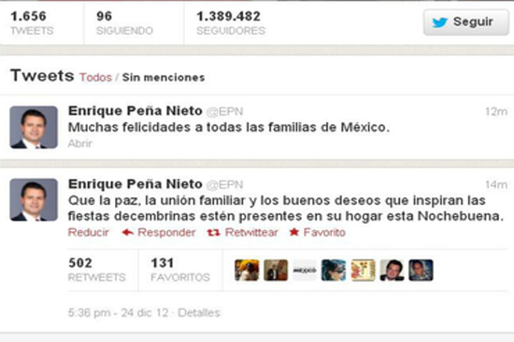 NOTICIAS 24/12/2012Sólo por twitter feliz navidad de EPNEn las horas previas a la tradicional cena de Nochebuena, el Presidente de México, Enrique Peña Nieto emitió un mensaje aprovechando su cuenta de Twitter con motivo de la celebración de este 24 de diciembre.