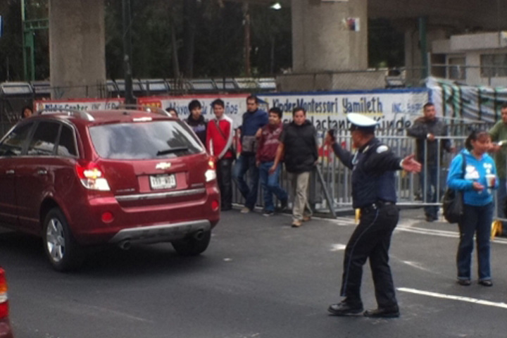 Los manifestantes lanzan consignas y reparten folletos a los automovilistas; los policías federales que se encuentran en la zona solamente los observan.
