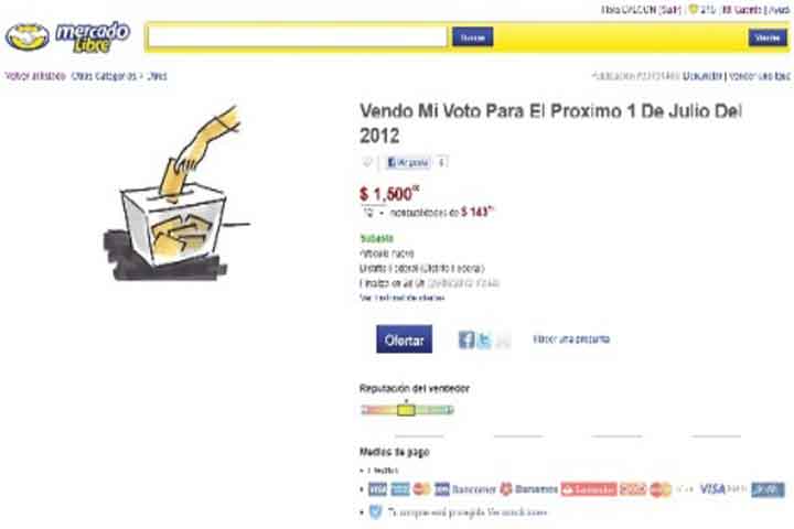 NOTICIAS 27/06/2012En Mercado Libre usuarios subastan su votoA través del portal de ventas Mercado Libre, usuarios de diversas partes del país venden su voto a cualquier partido que así lo desee.