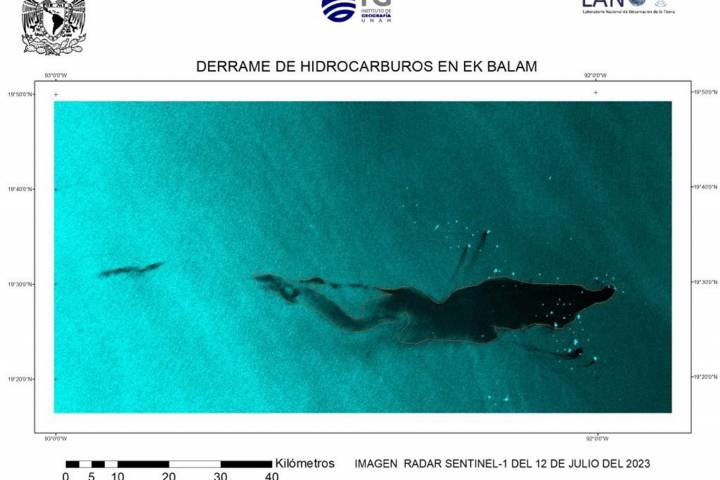 NOTICIAS 22/07/2023Al menos 467 kms. cuadrados la extensión del derrame en Ek BalamAcadémicos del Instituto de Geografía (IGg) y del Laboratorio Nacional de Observación de la Tierra (Lanot), de la UNAM, dieron seguimiento, a través de imágenes de radar, a las dos fugas registradas en los campos petroleros de Ek Balam mediante las cuales estimaron que para el 12 de julio el derrame de hidrocarburos alcanzó una extensión de 467 kilómetros cuadrados.