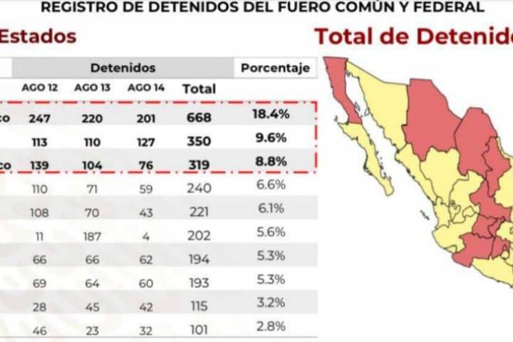 NOTICIAS 15/08/2022Michoacán el sexto estado con más detenidos durante el pasado fin de Semana Durante el pasado fin de semana en el que varios puntos del país vieron operativos policiales y militares que tuvieron como resultado en la detención de 3 mil 630 personas por delitos de los fueros común y federal, Michoacán fue la sexta entidad en más personas fueron aseguradas por las autoridades