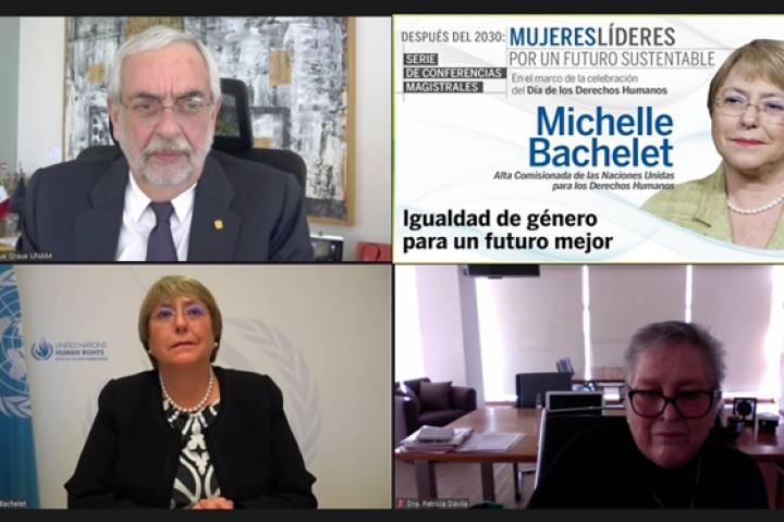 NOTICIAS 07/12/2021Michelle Bachelet en la UNAMAl participar en el foro de la UNAM "Después del 2030: Mujeres Líderes por un Futuro Sustentable", Michelle Bachelet Jeria, Alta Comisionada de las Naciones Unidas para los Derechos Humanos, afirmó que no podemos enfrentar los retos actuales si seguimos excluyendo a las mujeres del liderazgo y la toma de decisiones.
