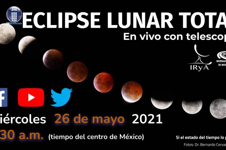 El Instituto de Radioastronomía y Astrofísica (IRyA) de la UNAM, Campus Morelia, invita a todo el público a participar de una sesión de observación virtual con telescopio para apreciar el eclipse lunar total, la madrugada de este próximo miércoles 26 de mayo a partir de las 4:30 horas (tiempo del centro de México), en transmisión en vivo a través de las redes sociales. "Un eclipse de Luna es cuando ésta se interpone en la sombra de ...