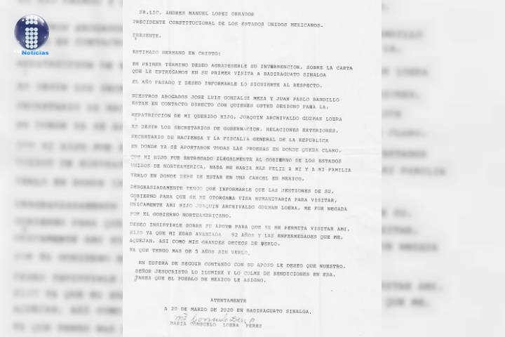 NOTICIAS 30/03/2020La carta que la mamá de "El Chapo" le entregó a AMLO El presidente de México, Andrés Manuel López Obrador, dio a conocer que la mamá de Joaquín "El Chapo" Guzmán le entregó una carta porque quiere ver a su hijo en Estados Unidos, pues no lo ha visto en 5 años.