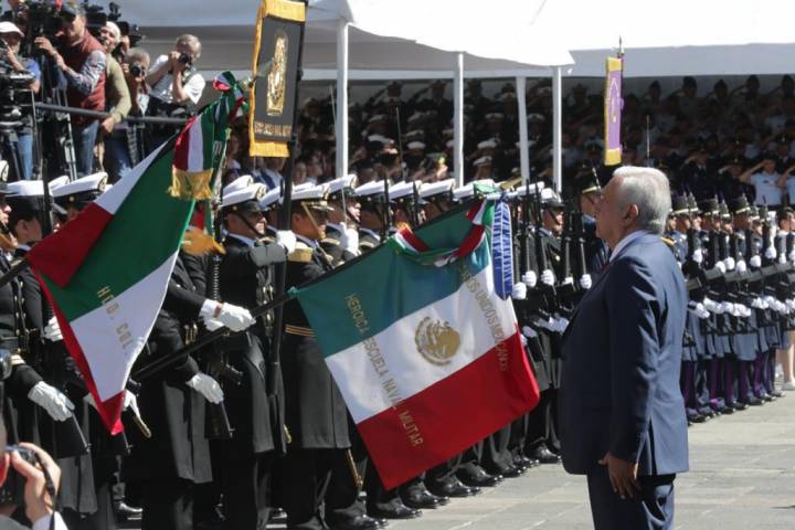 El primer mandatario arribó al alcázar del Castillo de Chapultepec escoltado por un oficial y 16 cadetes del Heroico Colegio Militar, saludó a la Bandera y pasó Lista de Honor a nuestros héroes patrios de 1847 y 1914: