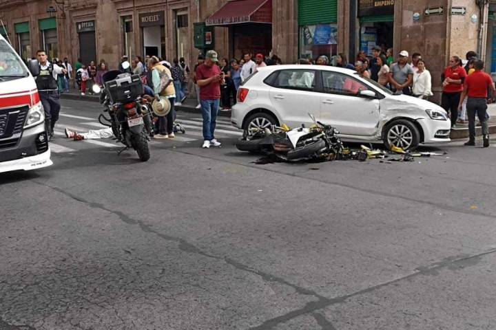 Uno de los percances ocurrió sobre la avenida Francisco I. Madero esquina con Belisario Domínguez, en pleno Centro Histórico. Se trató de un aparatoso choque entre una moto amarilla y un auto blanco. El piloto del motociclo quedó herido y fue atendid... Ver más...