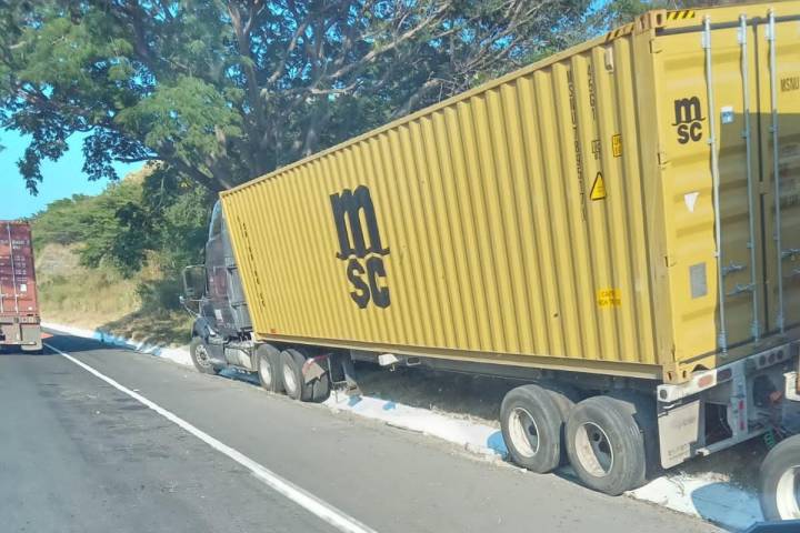 Se trata de un tráiler con cabina de color gris que remolcaba dos contenedores amarillos con razón social "msc", que se salió hacia el lado derecho del camino y quedo por fuera del acotamiento, ocasionando derrame de combustible.