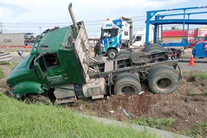 Un tractocamión se salió de la carpeta asfáltica y se fue a un canal de desagüe pluvial de la autopista Siglo XXI, sin que afortunadamente hubiera personas lesionadas a decir de fuentes de rescate.