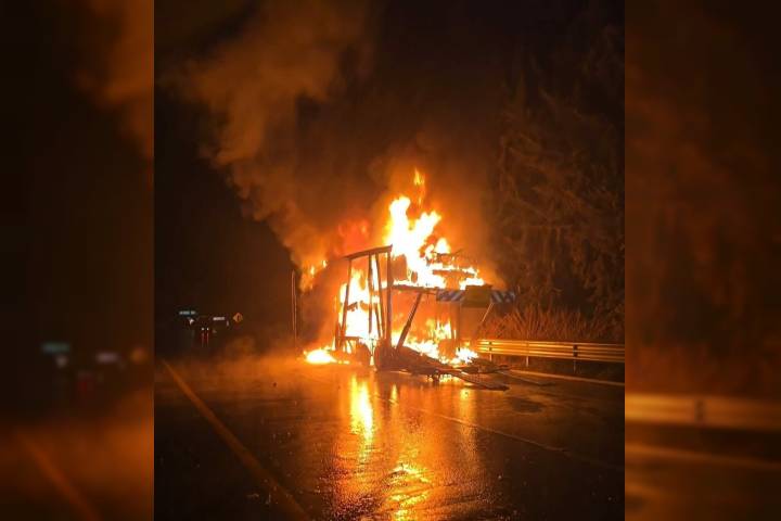 Un tráiler tipo nodriza que transportaba vehículos nuevos se incendió por una aparente falla mecánica, cuando circulaba sobre la autopista Siglo XXI, en el tramo carretero Uruapan-Pátzcuaro.