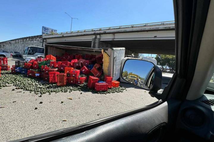 Camión aguacatero vuelca en la lateral del Boulevard Industrial