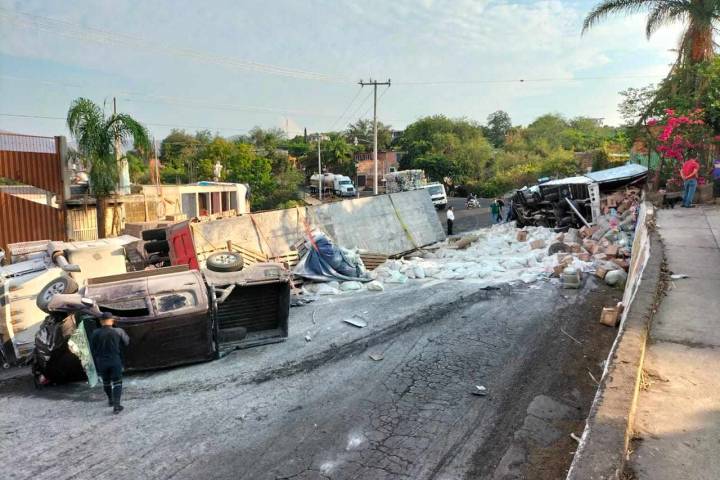 Saldo de cuatro personas lesionadas, así como cuantiosos daños materiales, fue el que dejó el choque volcadura de un tráiler, un torton y una camioneta en este municipio de Tocumbo. Además un domicilio resultó con afectaciones.