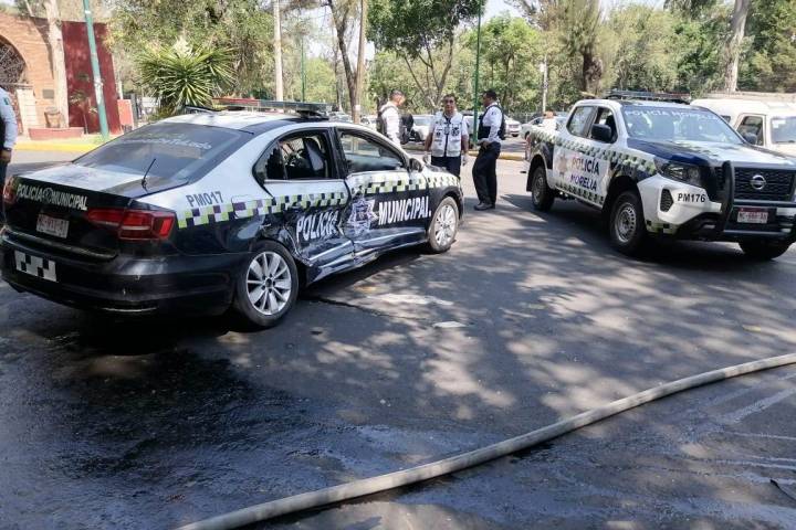 La mañana de este sábado, dos elementos de la Policía Municipal resultaron lesionados, tras el choque de su patrulla y una camioneta, sobre la avenida Camelinas, a la altura la Estación 2 de la base Bomberos Morelia.