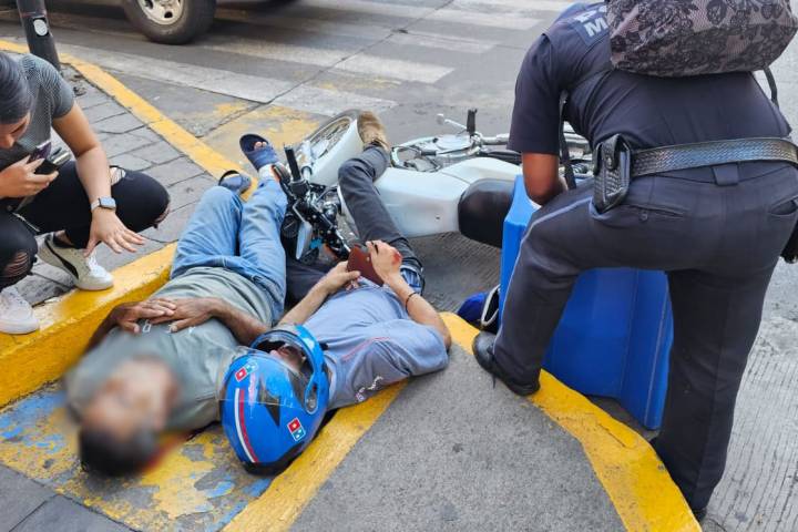 Un hombre de la tercera edad que viajaba en una bicicleta resultó lesionado al ser arrollado por un repartidor de Domino's Pizza, quien por su parte también que sufrió algunos golpes.