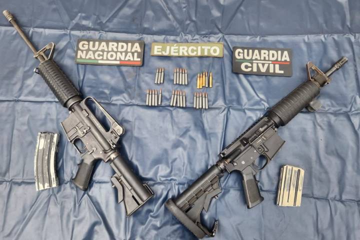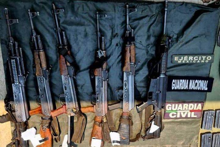 En un operativo conjunto implementado por personal de la Guardia Civil, Ejército Mexicano y Guardia Nacional, tras una agresión a balazos por integrantes de una célula delincuencial, lograron detener a cuatro masculinos, a quiénes les aseguraron seis armas largas, una granada de mano, dos vehículos.