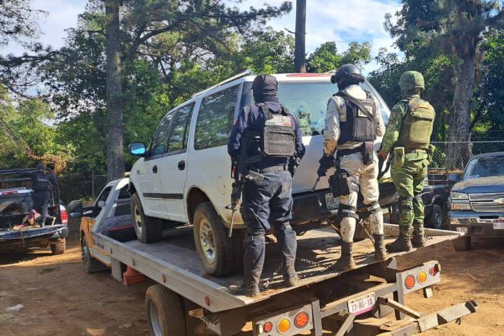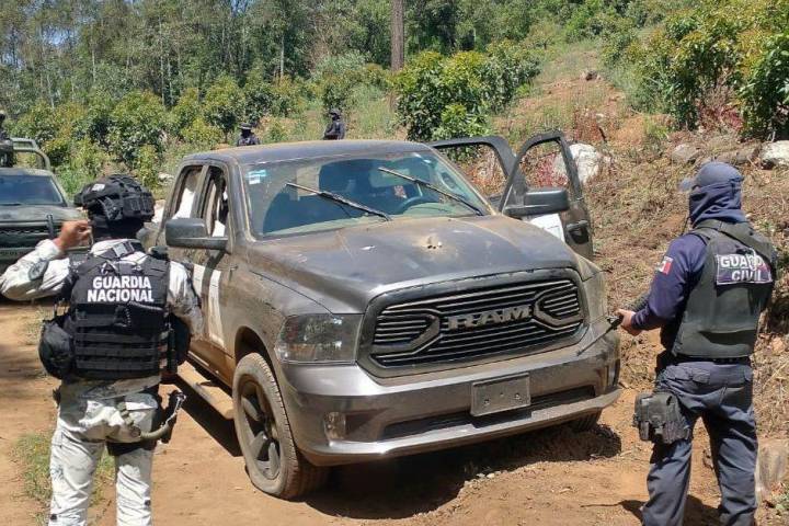 Personal de la Guardia Civil Zitácuaro, en un recorrido en la comunidad denominada "Y Griega", localizó dos camionetas abandonadas con impactos de arma de fuego y equipo táctico militar.
