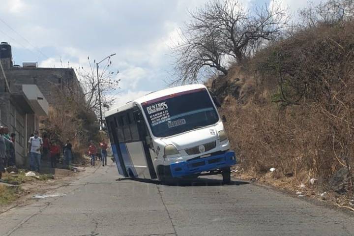 Tremendo susto vivieron los ocupantes de un camión de pasajeros, luego de que en una pendiente se le salieran las llantas traseras de su costado derecho. Afortunadamente no hay personas heridas.