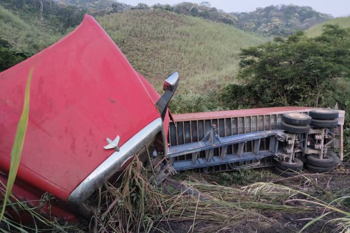 El aparatoso accidente tuvo lugar, en el kilómetro 264 del tramo carretero Las Cañas – Feliciano, donde un camión Peterbilt de color rojo con placas 37-UZ-1X, terminó destrozado por fuera de la vialidad.