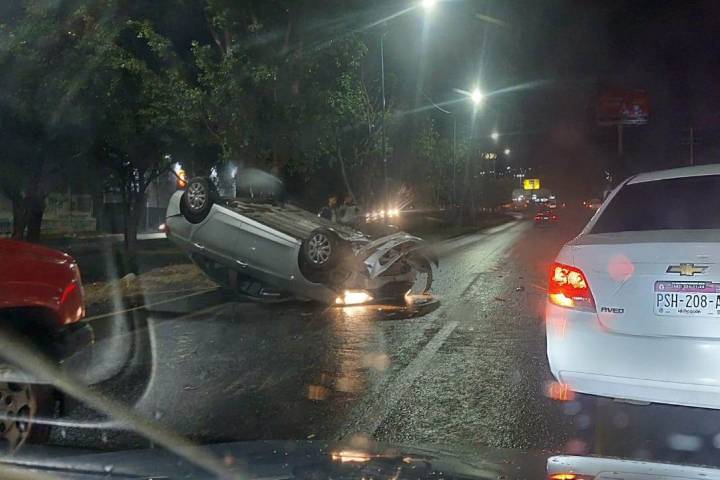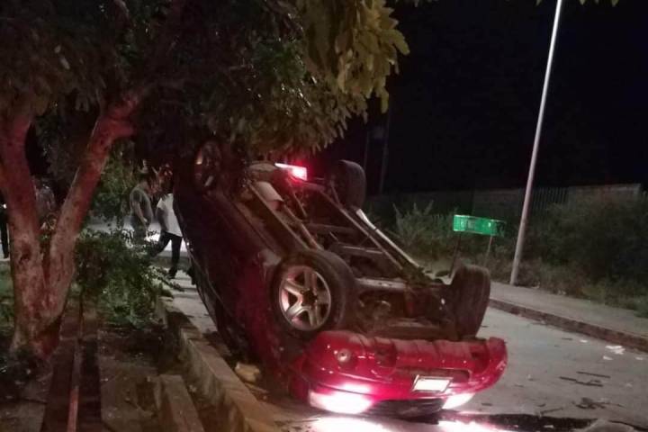 En dicho sitio el chófer de un vehículo color rojo, perdió en control del volante una unidad término volcada sobre su toldo.