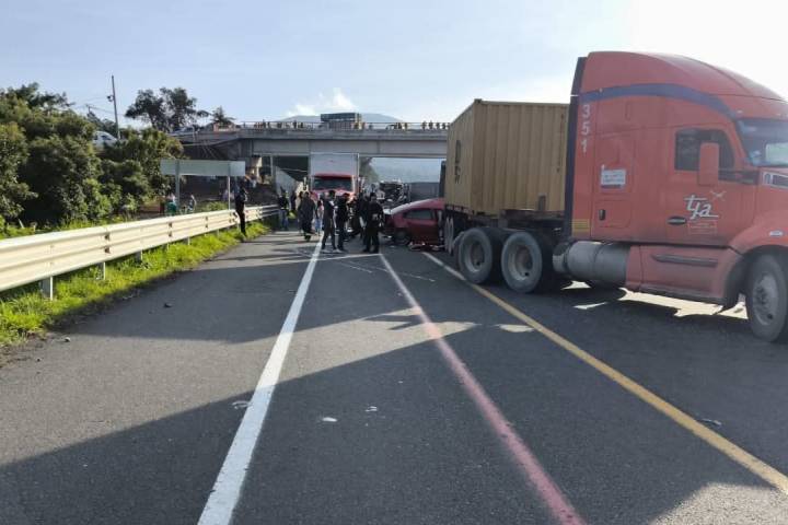 El choque de frente entre dos camiones de carga dejó como saldo tres personas lesionadas y cuantiosos daños materiales, en la autopista Siglo XXI.