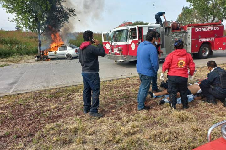 Fue durante labores de patrullaje que los elementos municipales encontraron un vehículo Platina color gris en llamas, en los límites de Tarímbaro y Revolución, mientras que el conductor estaba tirado en el asfalto con la cabeza manchada de sangre.