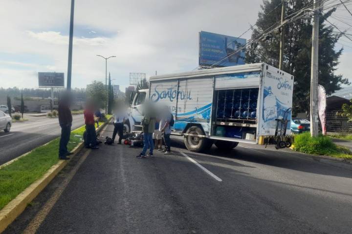Un joven motociclista resultó lesionado tras chocar contra uno de los costados de un camión repartidor de agua Santorini, hecho que ocurrió al sur de Morelia, indicaron fuentes policiales y de rescate.